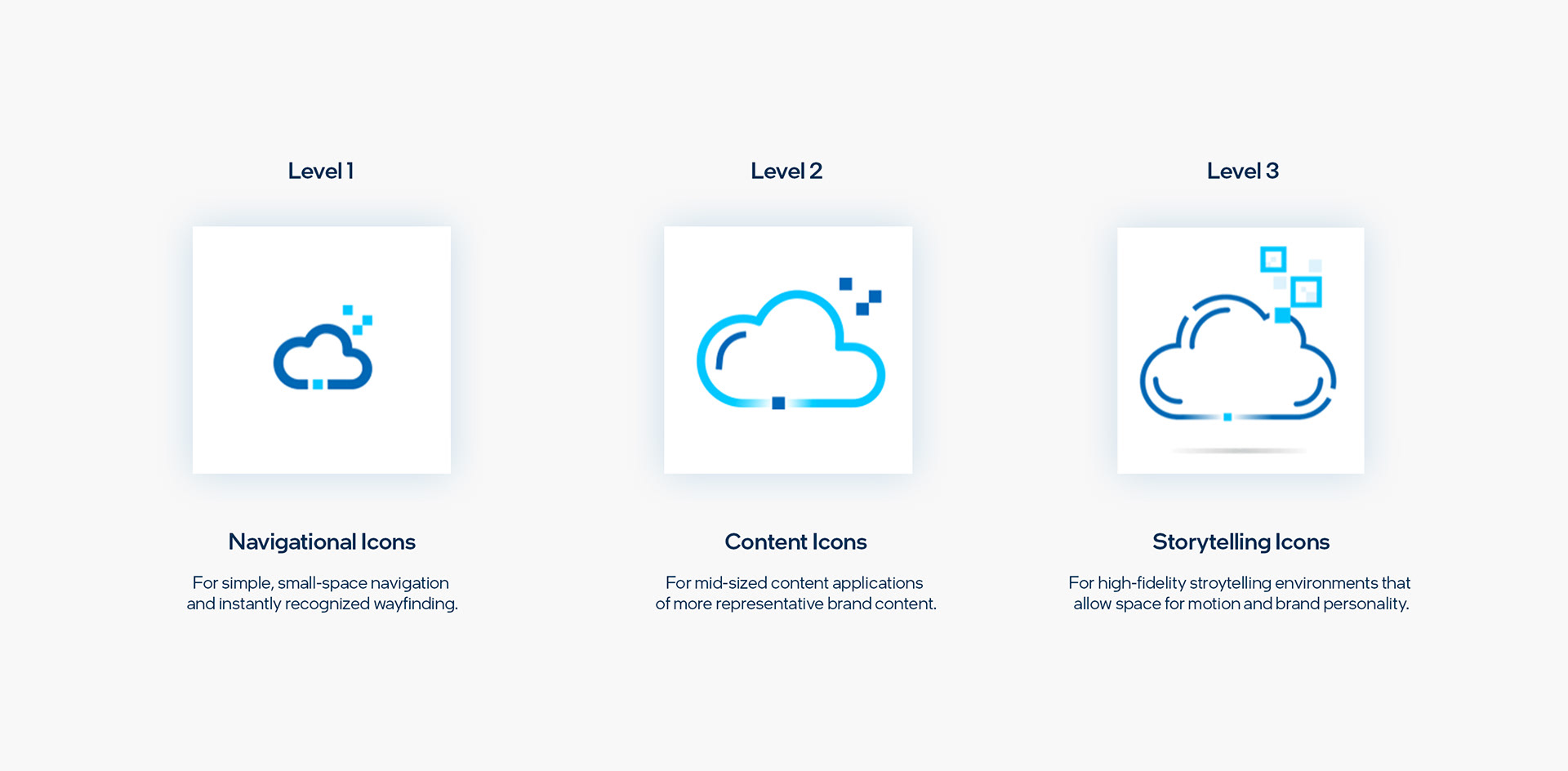 The newly developed icon system establishes a more unified, consistent and flexible standard across all Intel properties. It is built on a multi-level, fidelity-based framework that embodies the new “Spark” brand motif.